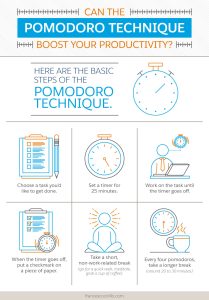 Consider using the popular Pomodoro Technique, whereby you work on a specific task for 25 minutes and then give yourself a five-minute break. Perform three to four Pomodoros a day, and your productivity is bound to skyrocket.